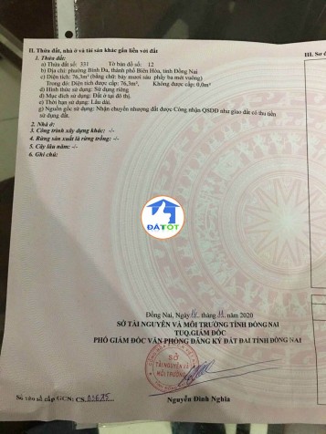 -Diện tích:76m2. Thổ cư 100%. Không quy hoạch . Hẻm 3m.